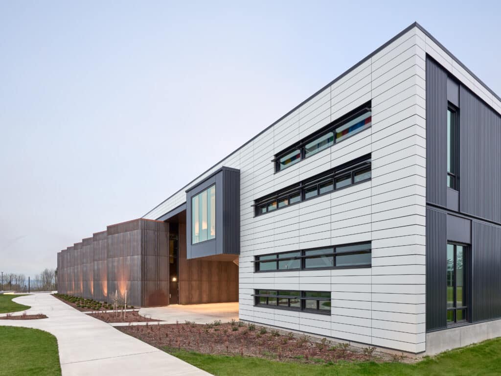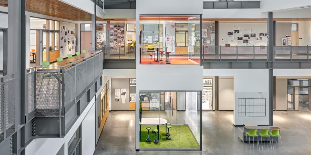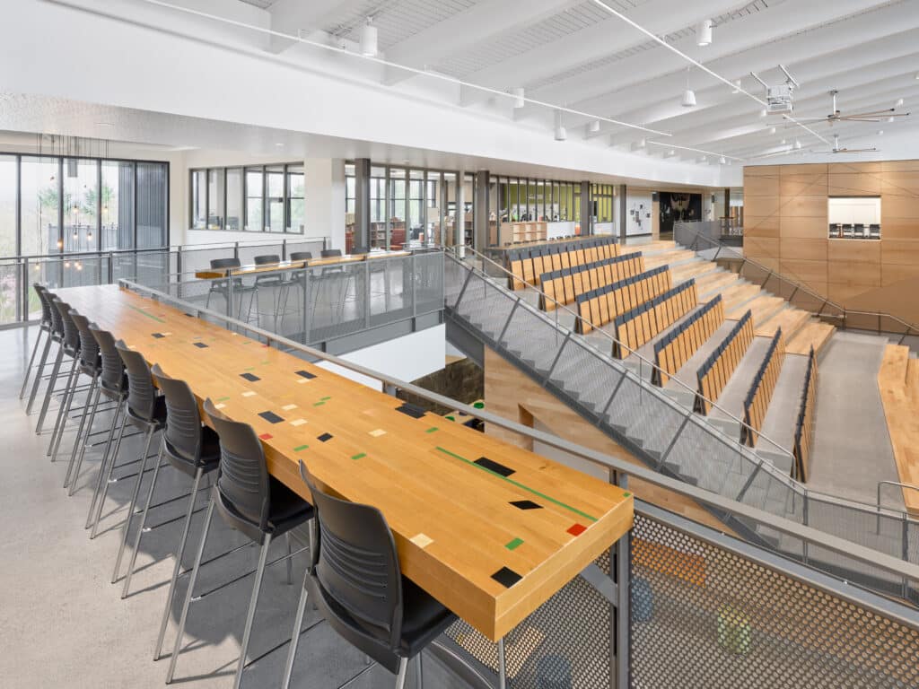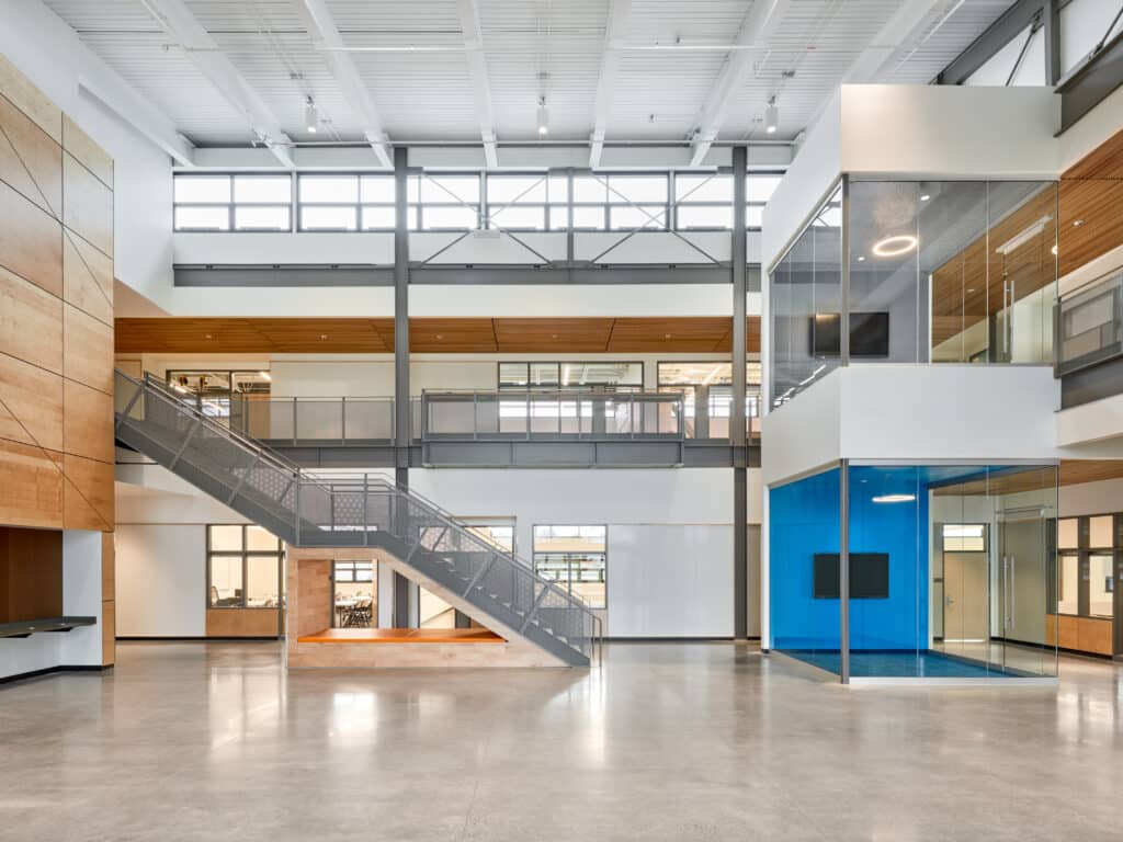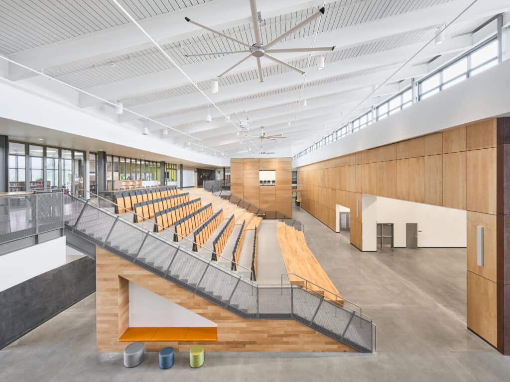 The Discovery High School project entailed the construction of a new two-story, 90,000 SF building adjacent to the existing PBL Middle School. The structure, made primarily of structural steel, is clad with cor-ten weathering steel and aluminum composite material panels. Interior finishes were meticulously chosen to create a modern and functional learning environment, featuring polished concrete, wood panels, and a folding NanaWall system. Notable features include a large Skyfold door and perforated metal panels. Exterior enhancements were designed to foster collaboration between students, with the inclusion of an outdoor amphitheater and commons area connecting the middle school and high school. The project included the development of a soccer field and offsite street lighting, as well as road revisions to accommodate the new facility.