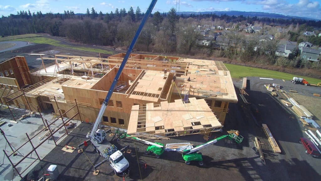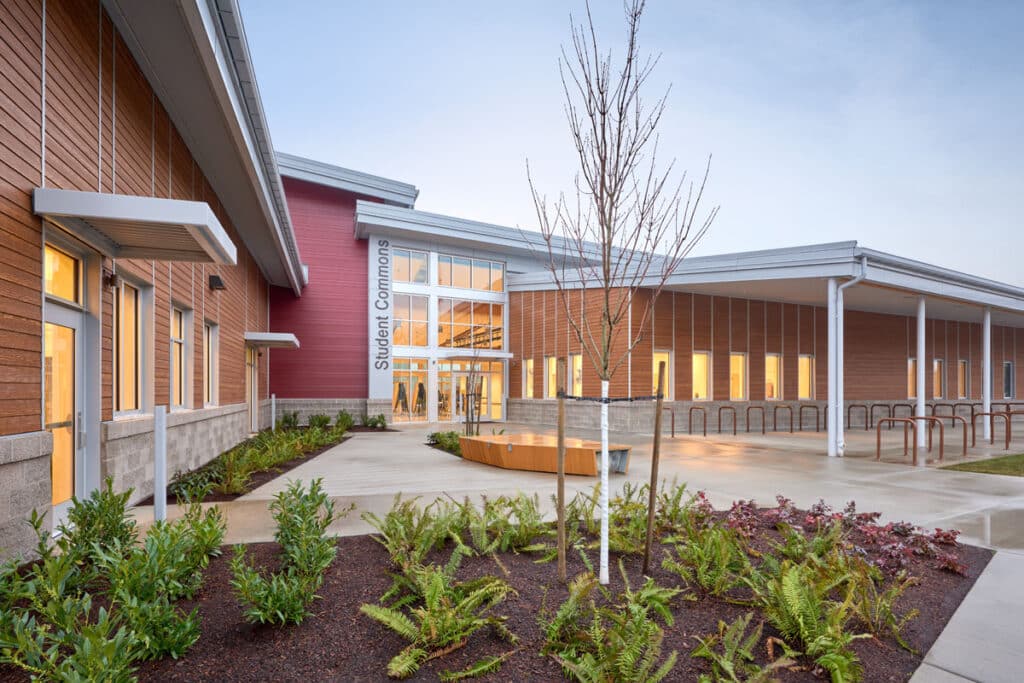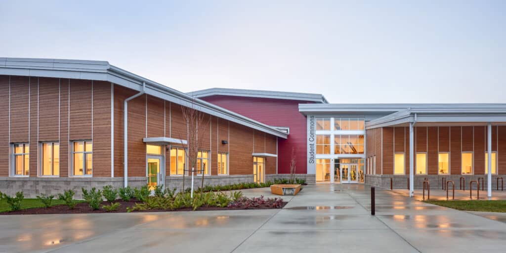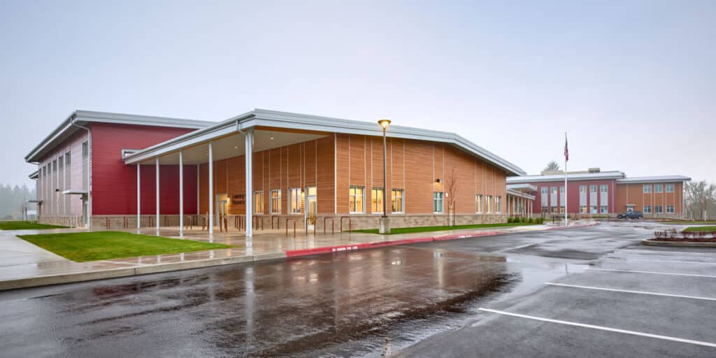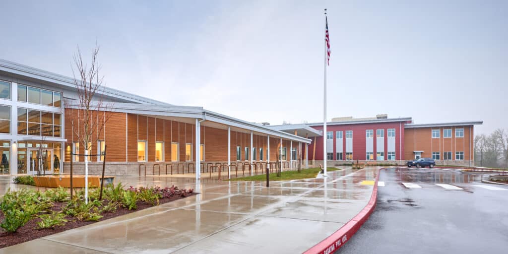 The centerpiece of the project is the stunning 102,000 square foot building, characterized by its innovative use of wood timbers and glulam beams throughout its construction. The two-story classroom wing has a modern and visually captivating library serving as its focal point. In addition to standard features such as new parking lots, concrete sidewalks, and custom benches, the project also boasts high-quality amenities including playground equipment. It includes a state-of-the-art track and field facility tailored to high school-grade standards, complete with the latest equipment and features, enhancing the school’s athletic offerings and community engagement.