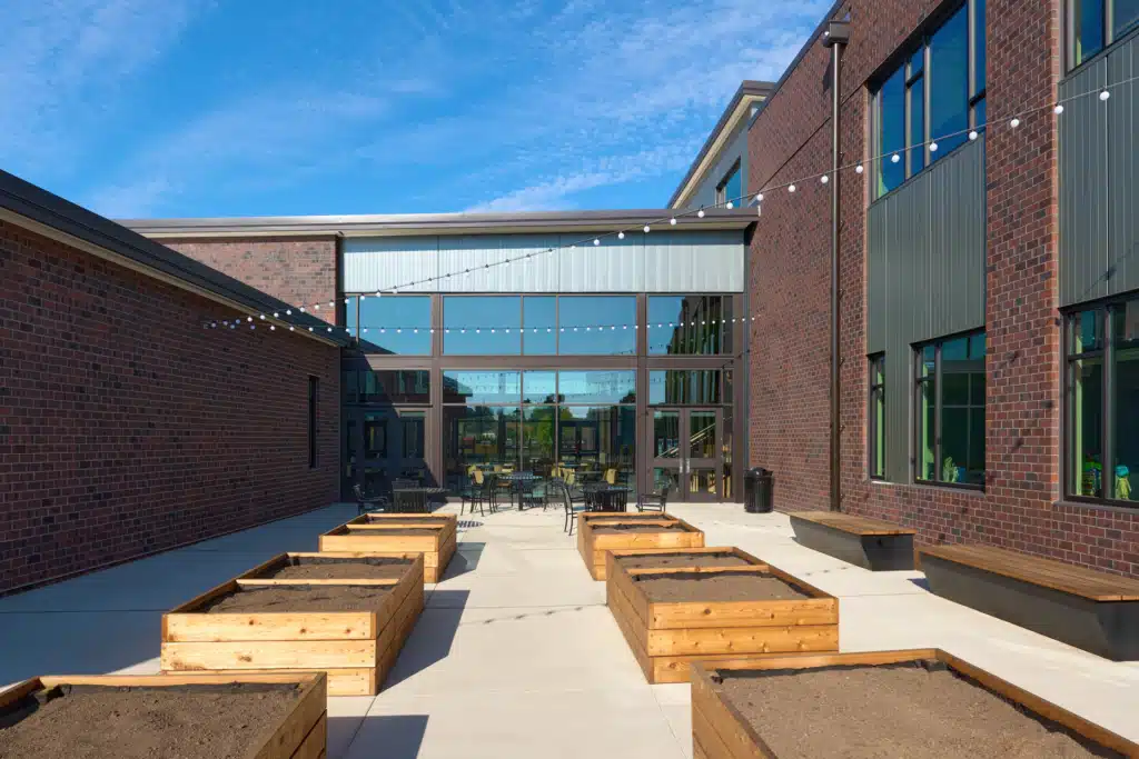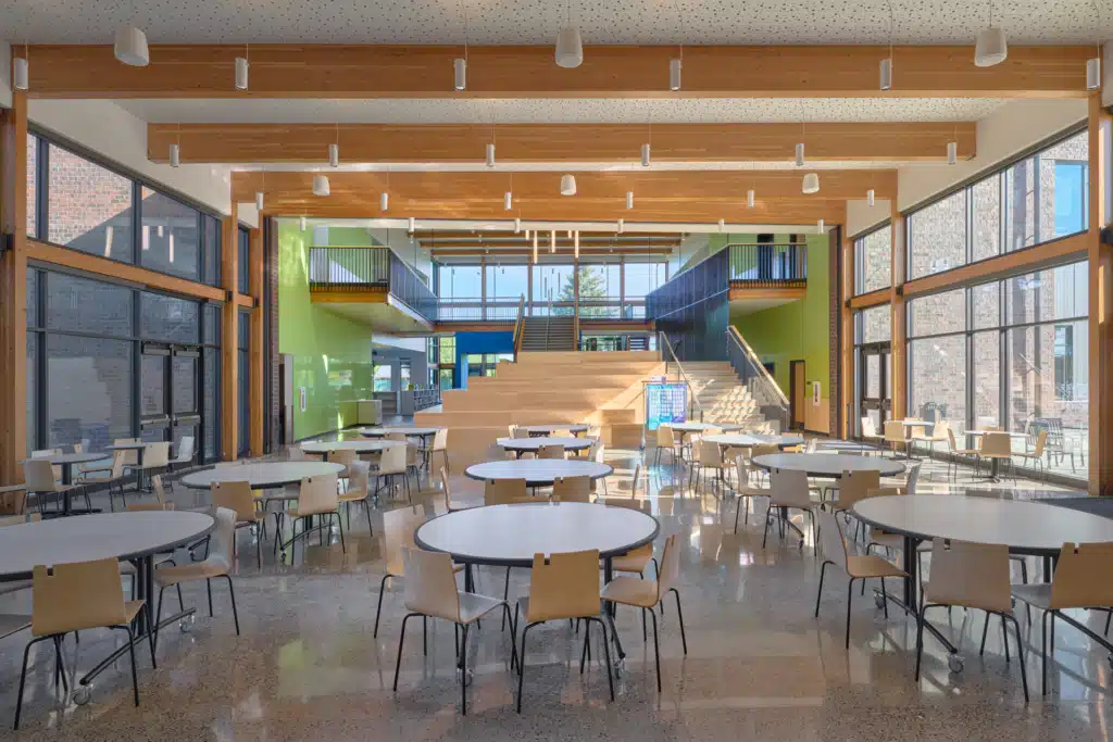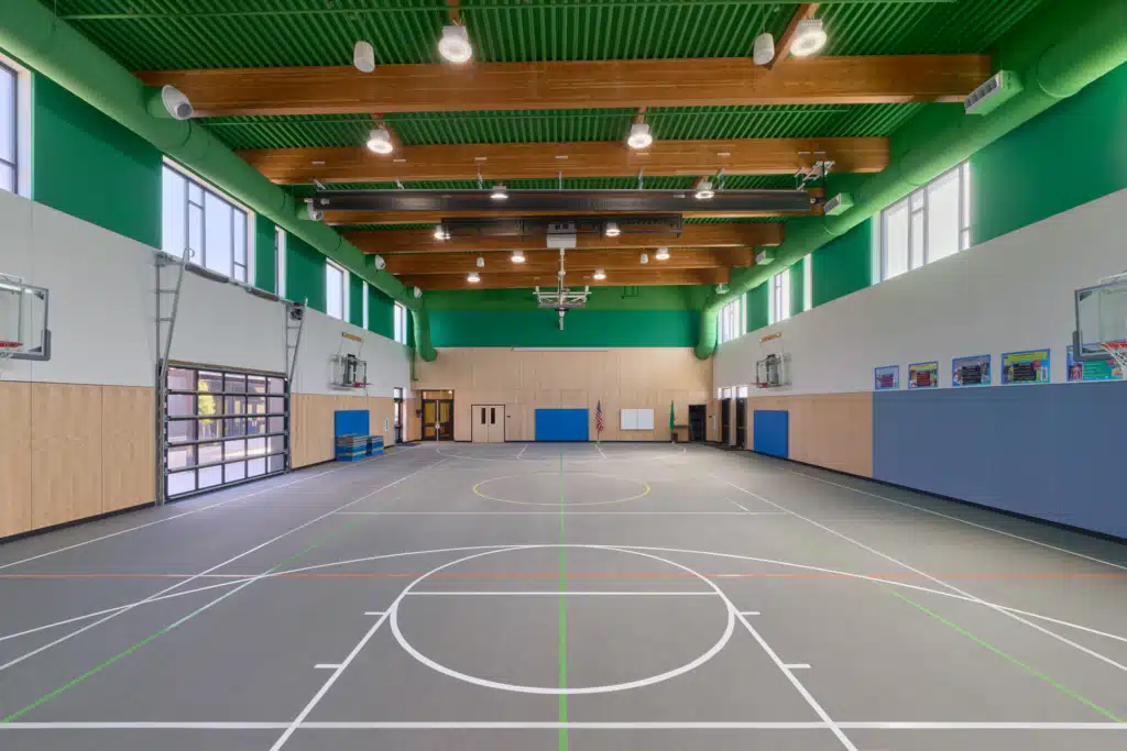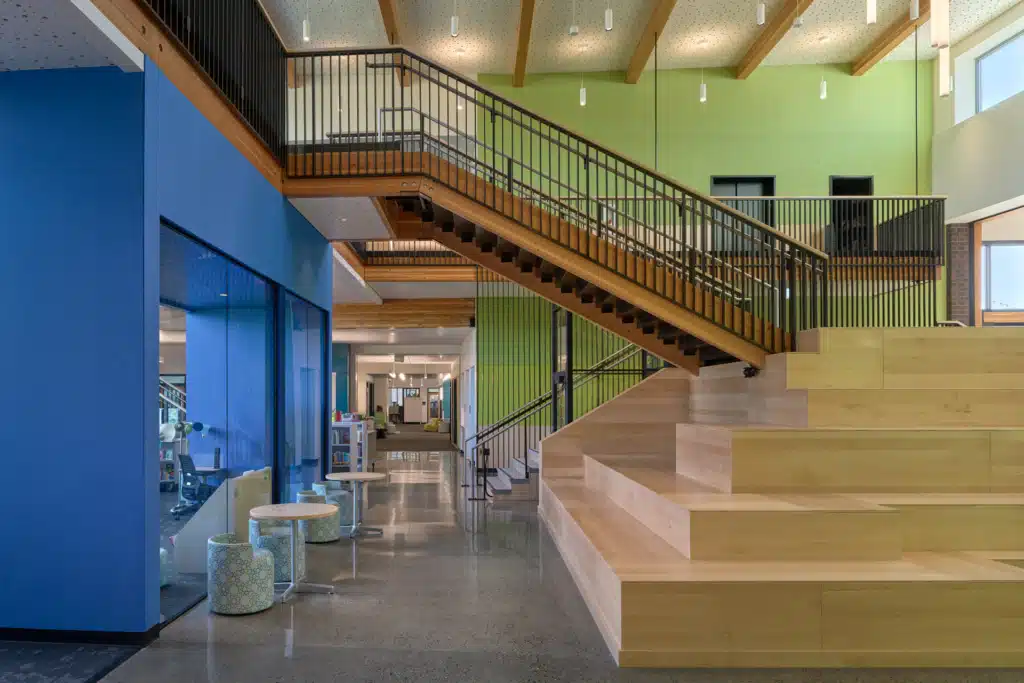 The heart of the new school is its central commons area. Here, polished concrete floors and warm wood paneling create an inviting atmosphere conducive to collaboration and community engagement. Flexible learning spaces, including the central learning stair, facilitate dynamic teaching approaches tailored to the diverse needs of our students. Emphasizing the importance of outdoor learning and play, the exterior areas of the school are thoughtfully designed to connect students with nature. Salvaged logs, basalt benches, and a nature play area offer opportunities for exploration, physical activity, and imaginative discovery.